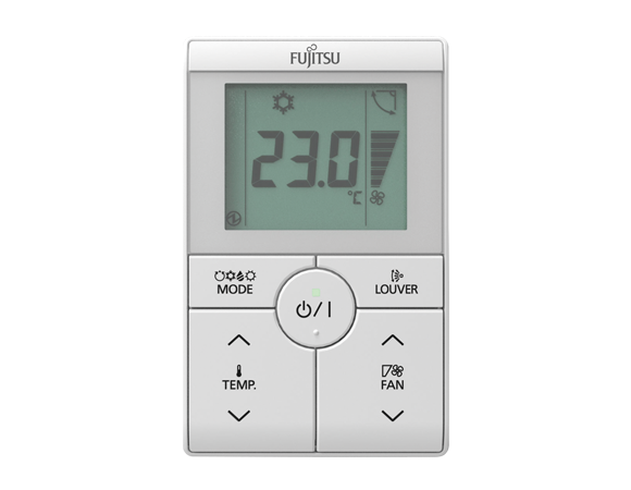 Fujitsu (Фуджитсу) UTYRSRY – пульт управления проводной упрощенный позволяет регулировать режимы работы, температуру воздуха и скорость вентилятора. Модель имеет компактные габаритные размеры и оснащена цифровым монохромным дисплеем.