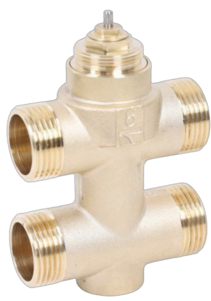 Четырехпортовый трехходовой клапан с приводом MDV (МДВ) TWVK09-T является закрытым, имеет байпас, обеспечивающий циркуляцию хладоносителя под углом 90 градусов в неактивном состоянии. При подаче напряжения на катушку, привод приводит поршень в действие, открывая основной проход для хладоносителя и одновременно перекрывая байпас.