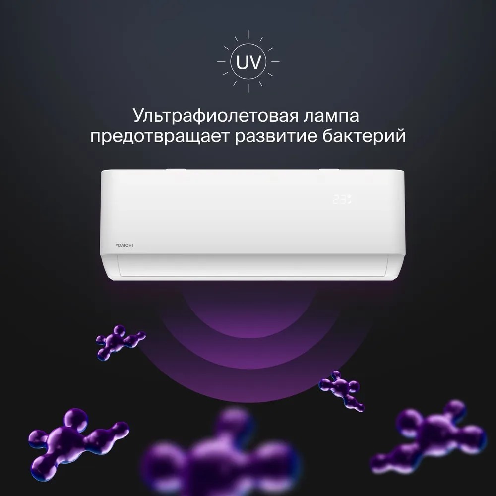 - Встроенная УФ-лампа предотвращает развитие бактерий на узлах внутреннего блока и обеззараживает воздух.