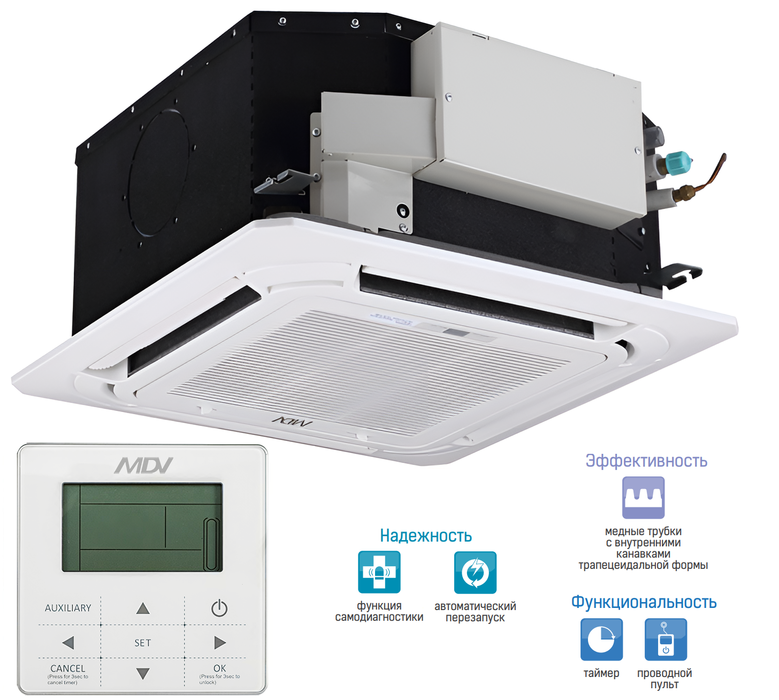 Компактная кассетная модель Mdv (Мдв) D28Q4/N1-A3(B) подойдёт для помещений с подвесными потолками и с небольшим запотолочным пространством. Эффективность теплообмена турбовентилятора происходит за счет более равномерного воздушного потока вокруг теплообменника внутреннего блока и обеспечивает равномерное распределение воздуха.
