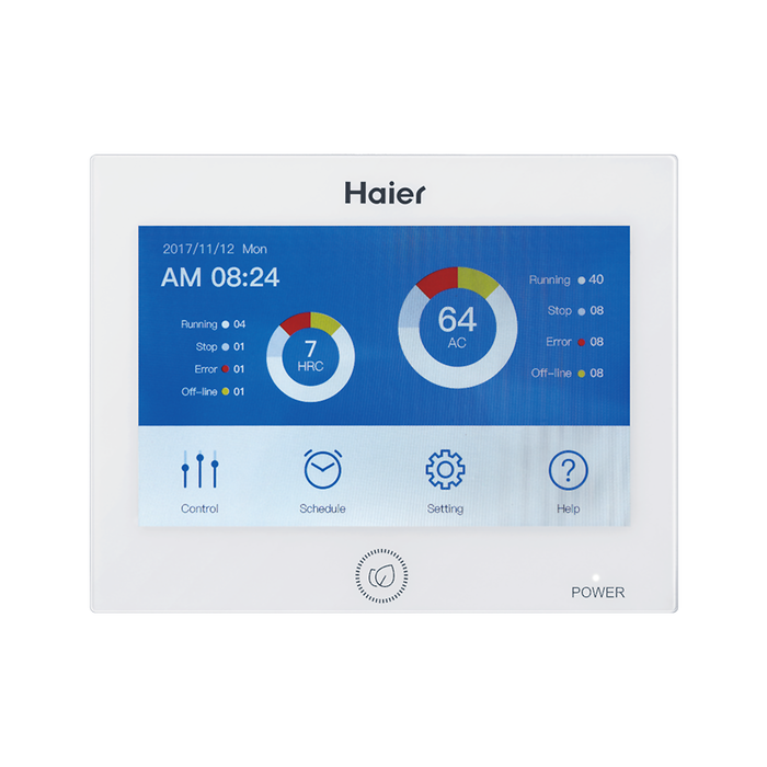 Центральный пульт до 64 блоков Haier (Хаер) HC-SA164DBT с интеллектуальным сенсорным дисплеем, позволяющий дистанционно управлять до 64 внутренних блоков. Задание расписания для блока, группы, добавление, изменение, удаление постоянного управления, управление модулем, групповое управление, ВКЛ/ВЫКЛ всех блоков.