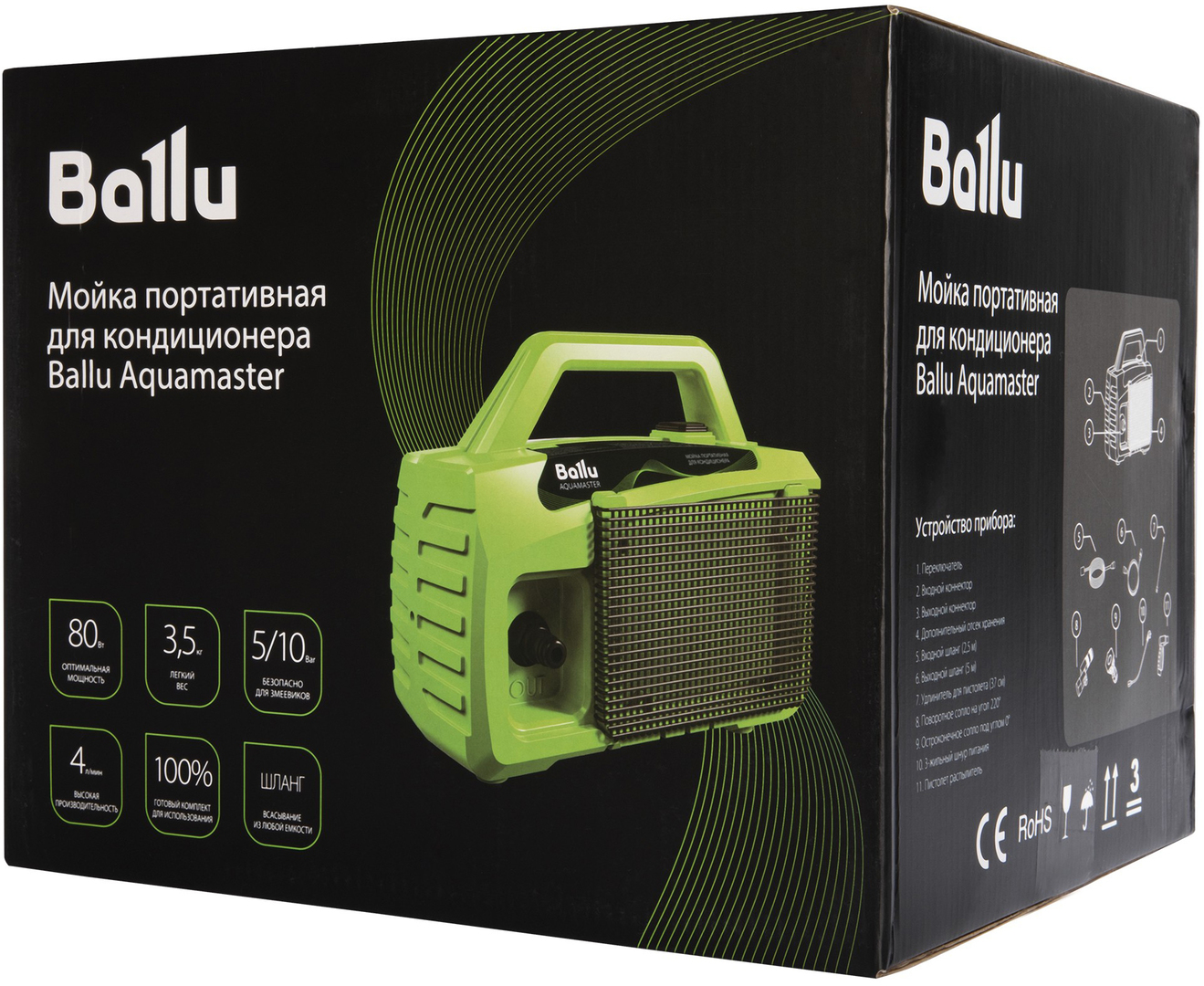 Мойка для сплит-систем Ballu (Баллу) Aquamaster обеспечивает быструю и эффективную очистку змеевиков в системах с кондиционерами. Для правильного обслуживания применяется специальный набор химии, который будет зависеть от хладагента. Комплект изделия полностью подготовлен для удобной транспортировки и хранения.